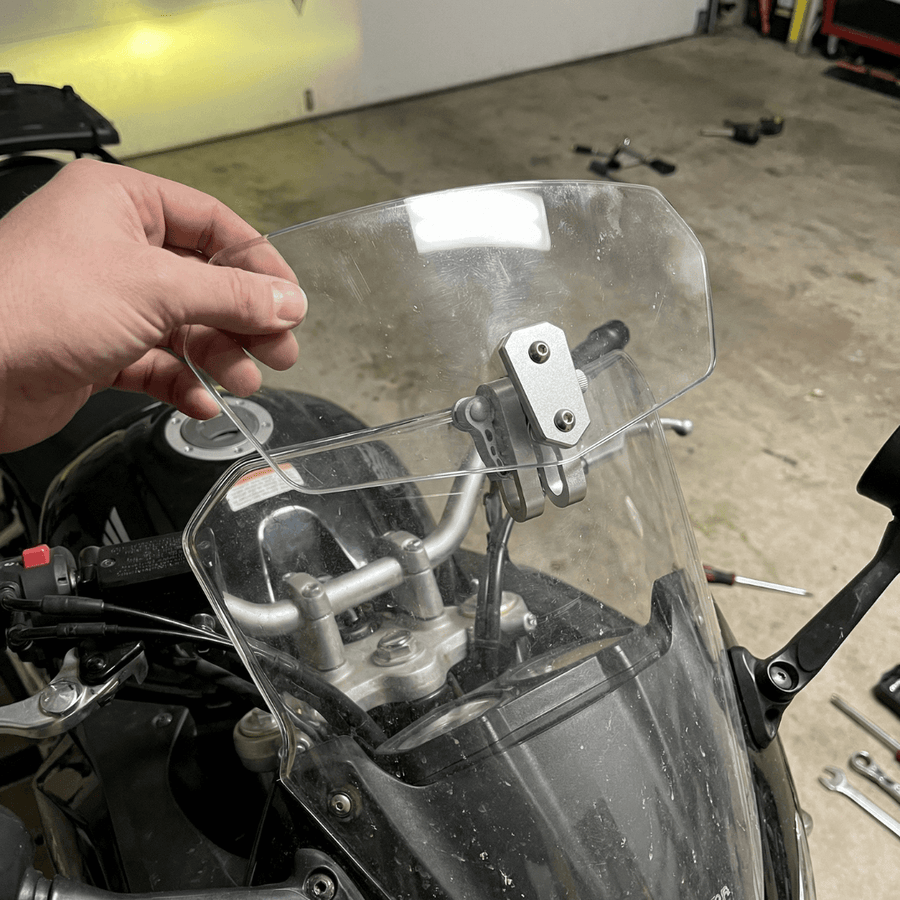 It clips onto your existing windscreen in minutes. No drilling. No permanent changes. Its angled visor surface redirects that turbulent air column upward and over your helmet, not into it. Riders on BMW GS, Honda CB500X, Triumph Tiger, Kawasaki Versys, Yamaha Tracer, and Suzuki V-Strom report the difference from their first motorway run. Not "slightly better." Sorted.