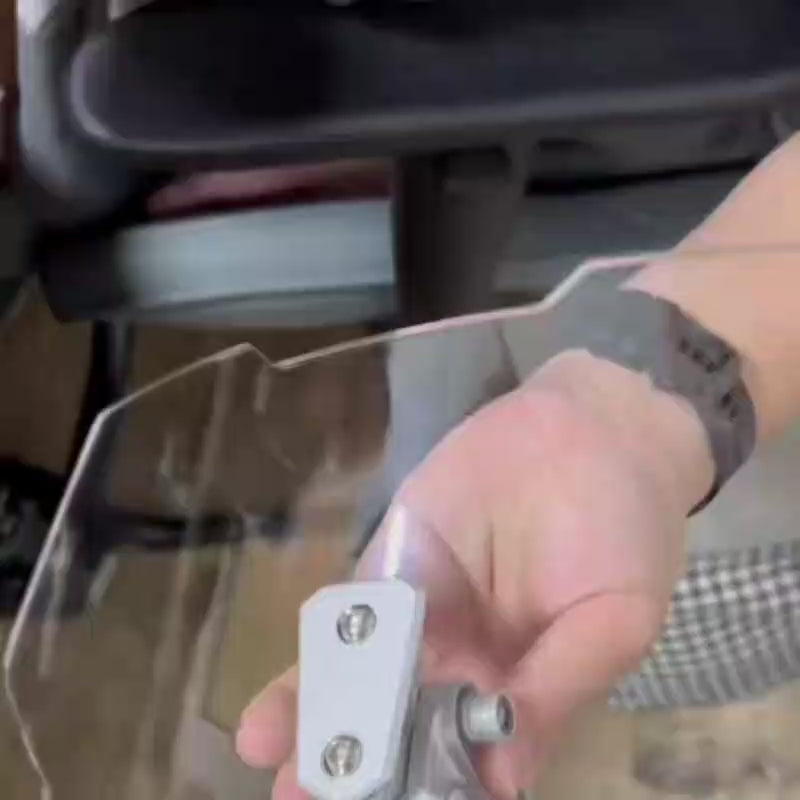 It clips onto your existing windscreen in minutes. No drilling. No permanent changes. Its angled visor surface redirects that turbulent air column upward and over your helmet, not into it. Riders on BMW GS, Honda CB500X, Triumph Tiger, Kawasaki Versys, Yamaha Tracer, and Suzuki V-Strom report the difference from their first motorway run. Not "slightly better." Sorted.